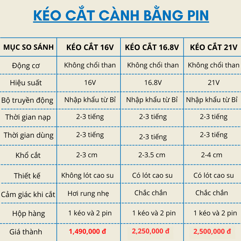 Để hiểu rõ hơn về thông số kỹ thuật của từng loại kéo cũng như giá bán của kéo cắt cành bằng pin tại Trâu Vàng, mời bà con theo dõi bảng so sánh dưới đây: